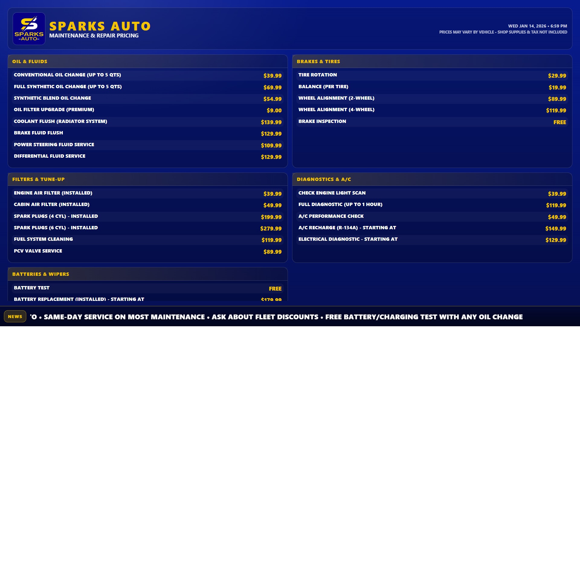 Clean, readable menus optimized for your screens and viewing distance. Update prices and items without reprinting anything.